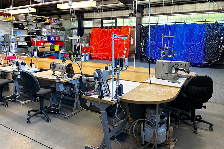 We have 6 different sewing machines that are each designed to handle different types of repairs. Some are designated for line work only, while others are for canopy materials, container repairs, binding work, and even jumpsuits!