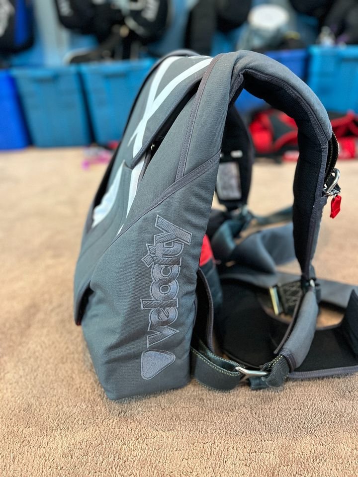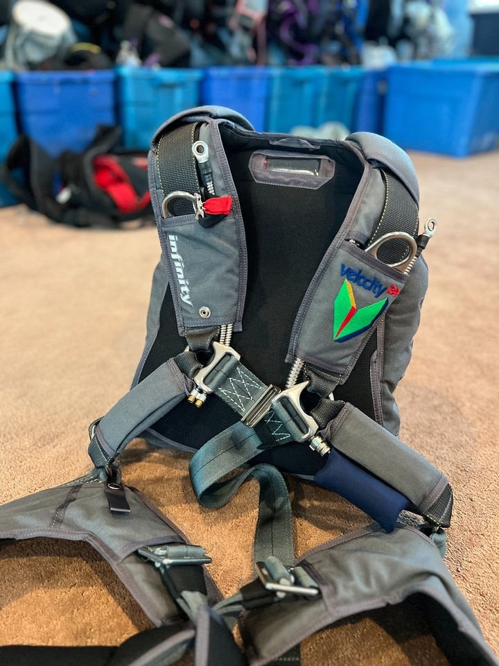 An “Infinity skydive container” refers to a custom-made skydiving rig manufactured by Velocity Sports Equipment, known for its high-quality design, emphasis on safety features, and customizable options, including contoured leg pads, tuck tabs on pilot chute handles, stainless steel hardware, and a well-designed main deployment bag, all aimed at providing optimal performance during a skydive; essentially, it’s a top-tier skydiving harness and container system designed for comfort and reliability.